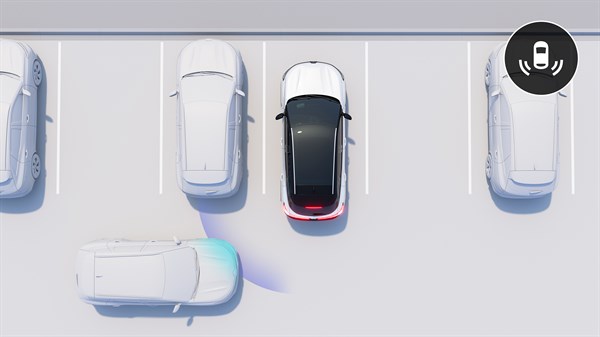 Tolatáskor a rendszer a hátsó és oldalsó radarok segítségével figyeli, hogy a gépkocsi hátuljához közeledik-e bármi, és szükség esetén figyelmeztet az adott oldali külső visszapillantó tükörben megjelenő fényjelzéssel, valamint a központi kijelzőn, a tolatókamera képén megjelenő piktogrammal. Ha a jármű mozgásban van, a rendszer hangjelzéssel is felhívja a figyelmet a veszélyre.